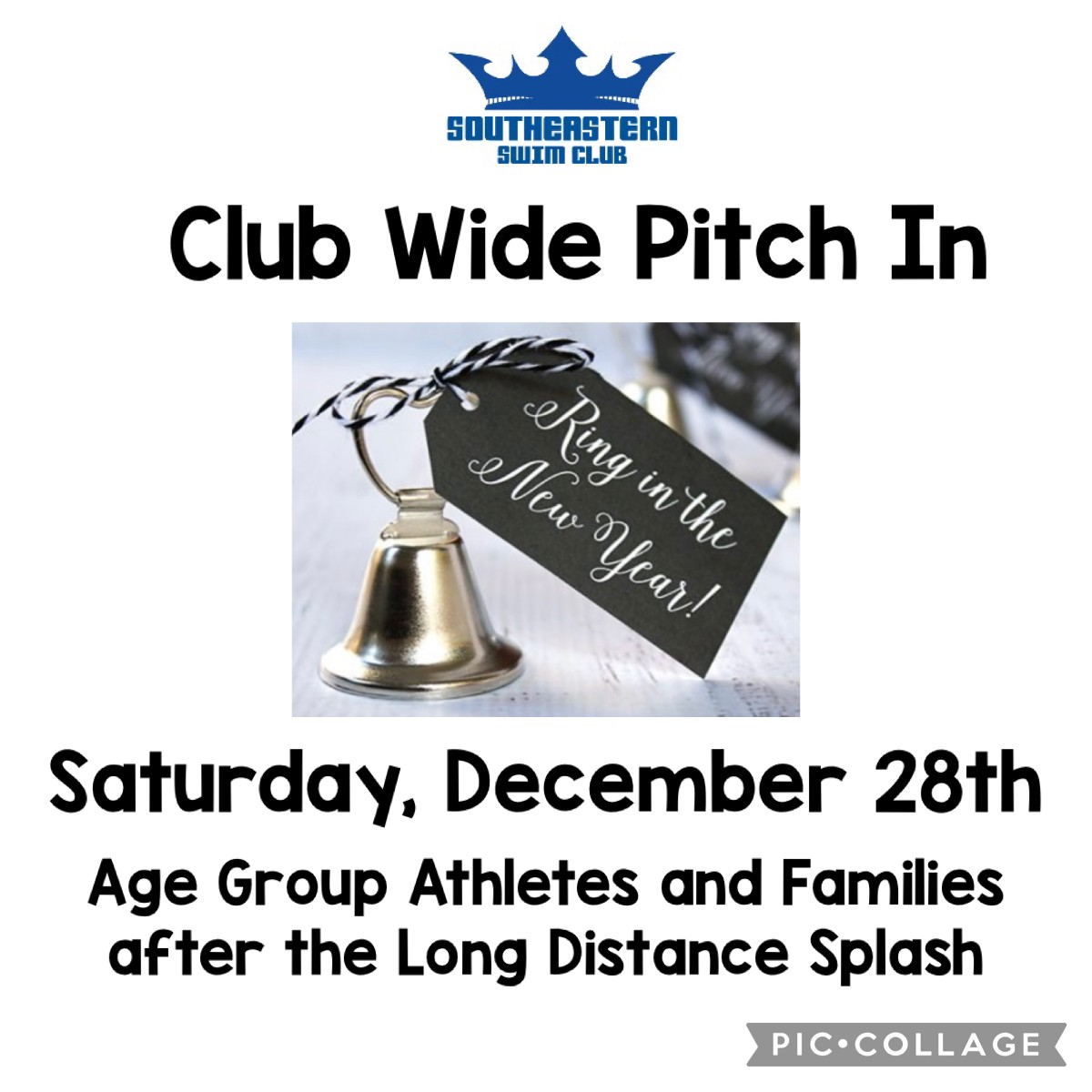 The Age Group athletes and their families are Ringing in the New Year with a continental breakfast Pitch In this Saturday, December 28th, as soon as the Long Distance Splash is over!!